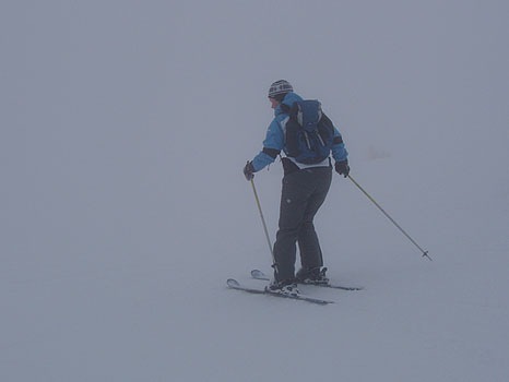 Võrreldes eilsega oli tänane päev mitte nagu öö ja päev, vaid nagu päike ja lumesadu :). Hommikul kodus sadas päris rämedalt vihma, mis umbes 1 300 peal muutus lumesajuks. Üleval oli nähtavus kohati puhas null (ja kohati peaaegu null, nagu näha ka juuresoleval pildil). Igatahes olime poole päeva pealt täielikud lumememmed.